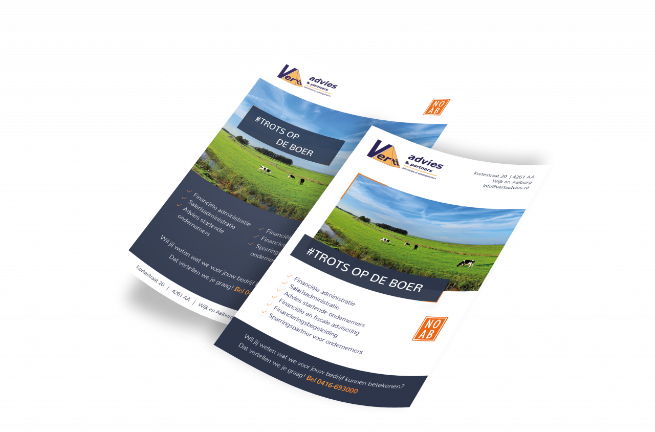 Maar ook alle uitingen van Verti Advies naar de buitenwereld toe worden door Dirk verzorgd. Spandoeken, banners, reclamedoeken, folders en advertenties. Net zoals de boekhouding van Dirk in goede handen is bij Verti, zo is de zichtbaarheid van Verti Advies dat bij Dirk.